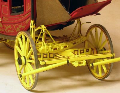 Weighing over two tons, the coaches were solidly built. The bodies rested on leather throughbraces - not for the passengers' comfort, but to prevent injury to the horses. The wheels were made of seasoned white oak to withstand the heat and the cold. Leather "boots" front and back held mail sacks and luggage.