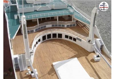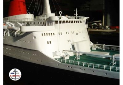 8 brass winches and 8 bases, canopies for gangways, doors and windows of the boarding deck and Sundeck deck, 20 lifeboats of 165 people, 2 speed boats, 2 whalers, 24 pairs of davits, patio, gym and swimming pool, life-saving containers, liferaft floats, letters FRANCE, various parts for masts, radars, frames windows on back block, wooden main mast, masts, gonio, plastic cone for compass, 15/10 and 10/10 brass rods for various parts, wood and cardboard for the building of the breakwater, 12 davit winches to assemble, 3 anchors, 50 lengths of thread 0.5 mm for railings,1 flag...