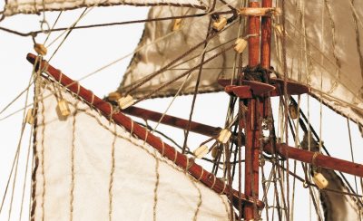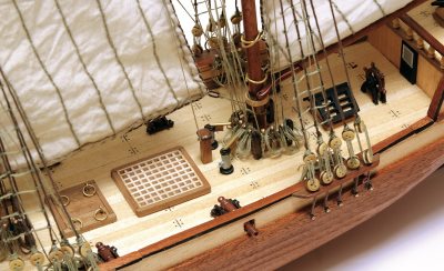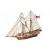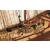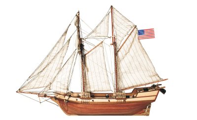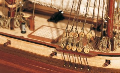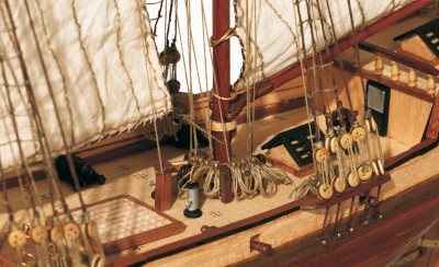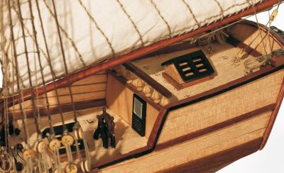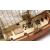 Double plank-on-frame, features laser-cut wooden parts. Accurately detailed fittings include boxwood blocks and deadeyes, brass eyebolts, rings and belaying pins, white metal winch and lifeboat, three diameters of rigging line and more. Eight antiqued metal cannon on serve as armament. Full complement of sails that are pre-sewn and ready to rig. Wooden display cradle and a metal nameplate.