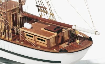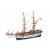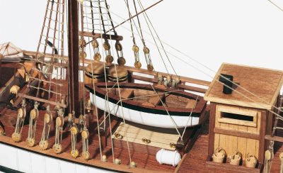 The Aurora kit features laser cut wooden parts and double planked hull. The fittings package contains ready-to-use boxwood blocks and deadeyes, cast metal lifeboat, blackened metal anchors, mast caps and ships wheel, brass nails, stanchions, eyebolts and belaying pins and many other detail parts. Kit also includes four diameters of rigging line, silk-screened flag, wooden baseboard with nameplate and pedestals. A full set of sails is pre-sewn and ready to rig.