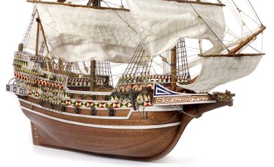 HMS Revenge was an English galleon built by Sir John Hawkins in the shipyards of Deptford in 1577. The design had some special characteristics. The ratio between the length and the breadth was narrower, forecastle and sterncastle smallers than typical galleons with low freeboard. These features provided better artillery stability. Under Sir Francis Drake's command participated in several battles