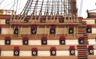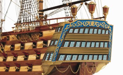 The Santísima Trinidad was built in Havana and launched on 2nd March 1769. It was the biggest warship of the 18th century, with 130 guns. After taking part in the naval campaigns of the late 18th and early 19th century, it last saw active service at the battle of Trafalgar, under the ensign of rear admiral Cisneros, where it was dismasted by the English fleet.
