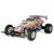 First introduced in 1983, the 2WD racing buggy Frog made a huge splash with its eye-catching design and high performance running. The Frog now makes a comeback, updated for a new age, but with its basic structure essentially unchanged. Preserving its characteristic space frame, the oil dampers for trailing-arm type rear suspension have been updated to diaphragm type. Rear drive shaft features dogbone type joint for secure power transmission. Sleek polycarbonate body remains the same, while 3-piece wheels feature front grooved and rear spike tires for excellent off-road running.