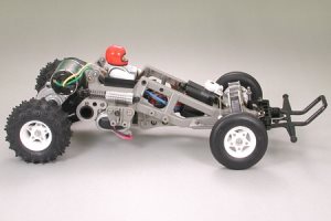 Electric R/C racing buggy features ABS space frame and nylon suspension and bumper for a lightweight yet rugged form that is perfect for off road running. Battery is held in ultra-low position, giving this car the stability and weight balance to handle rough terrain and wild jumps. Advanced 4-wheel independent suspension composed of front double wishbone type featuring in-board spring and durable steel radius arm. Rear trailing arm type features horizontally mounted aluminum cylinder oil dampers for effective shock absorbtion. Sealed differential gearbox ensures high speed cornering, while full ball bearings and 3-step gear ratio secures maximum transmission efficiency.